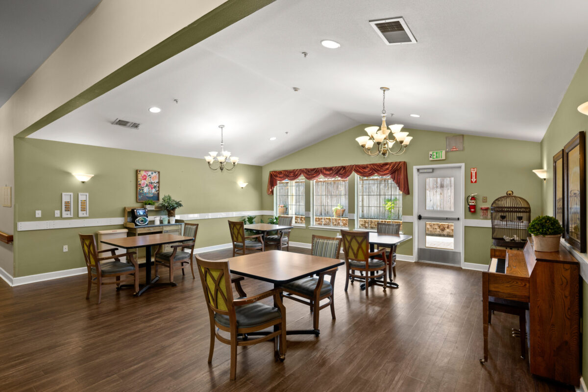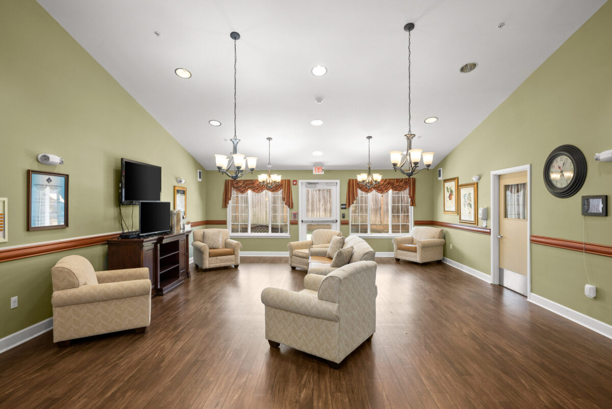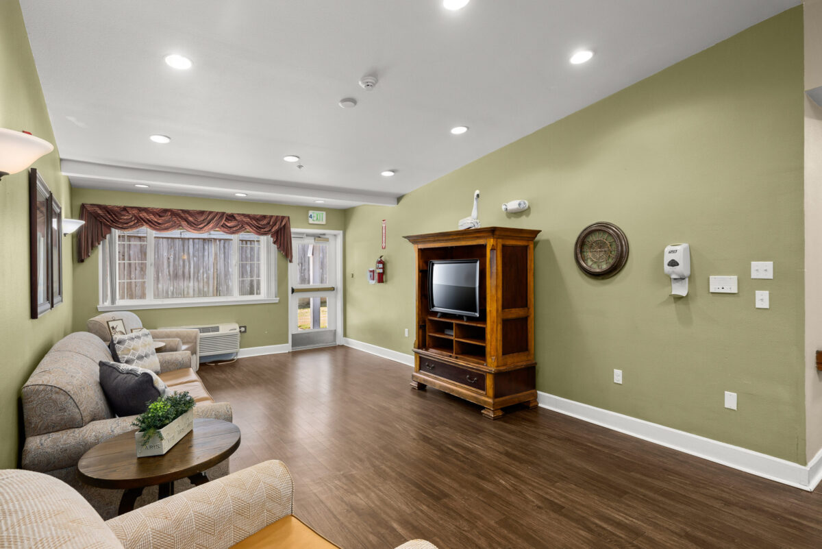 INTERIOR A panoramic shot of a kitchenette with dark wood cabinets, a sink, a dining table with chairs, and a window with a valance A panoramic shot of a dining room with multiple tables, chairs, chandeliers, and a clock on the wall A panoramic view of a dining room with multiple tables set for meals, chandeliers, and framed art on the walls A panoramic shot of a communal seating area with a patterned couch, two armchairs, a television, and a hallway visible on the right A panoramic view of a bedroom with a plaid bedspread, a chair, a sliding closet door, and an open doorway leading to an adjacent room A panoramic view of a bedroom featuring a bed, a dresser with a lamp, and a bathroom vanity with a mirror and sink