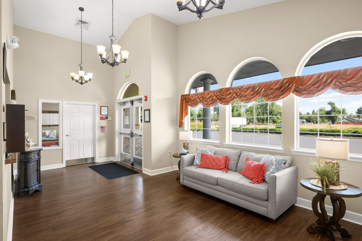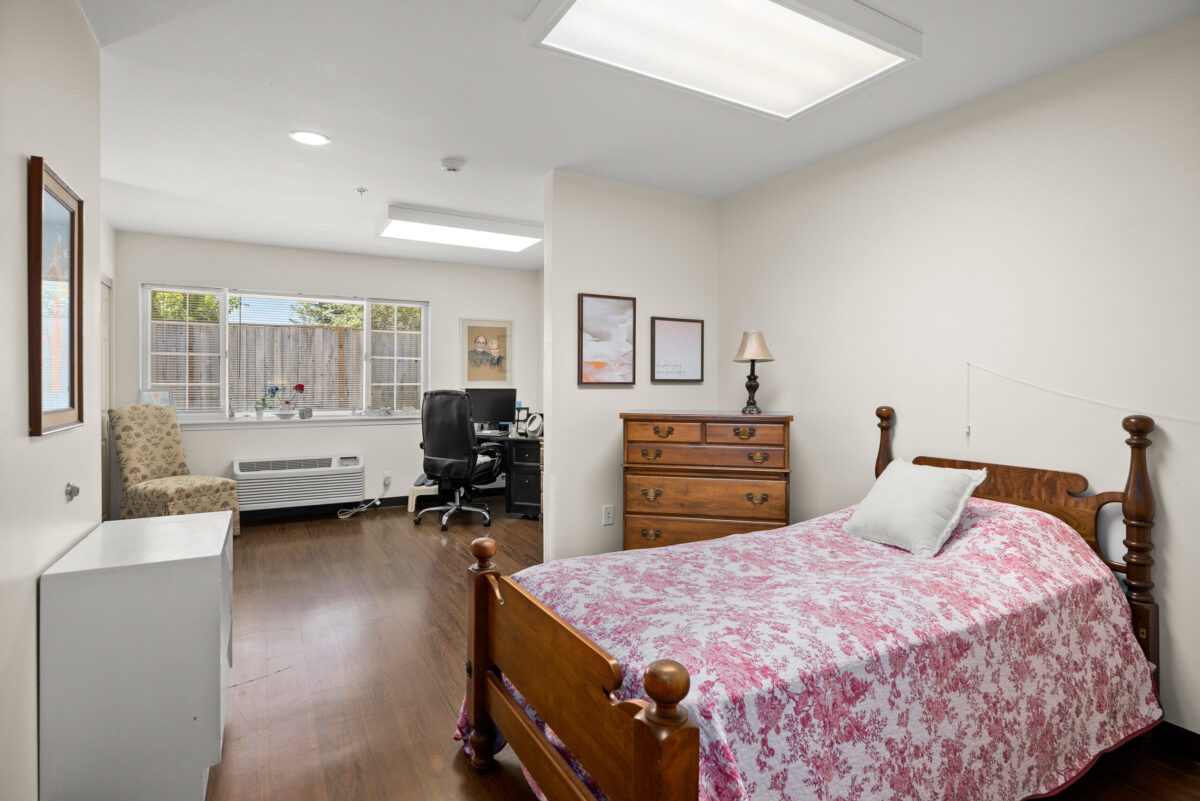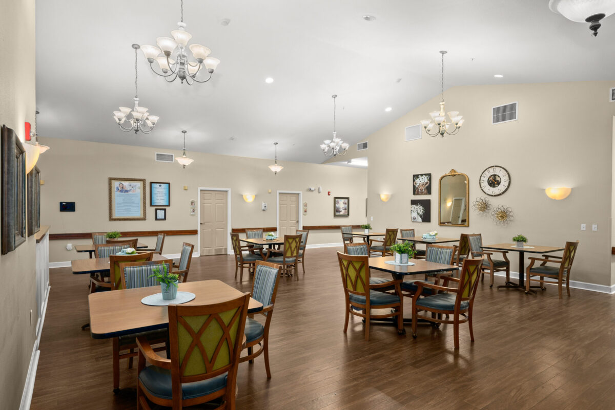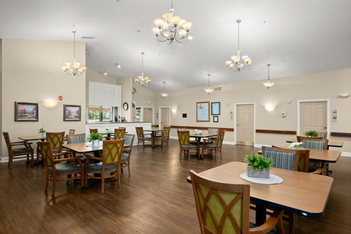 INTERIOR A panoramic shot of a kitchenette with dark wood cabinets, a sink, a dining table with chairs, and a window with a valance A panoramic shot of a dining room with multiple tables, chairs, chandeliers, and a clock on the wall A panoramic view of a dining room with multiple tables set for meals, chandeliers, and framed art on the walls A panoramic shot of a communal seating area with a patterned couch, two armchairs, a television, and a hallway visible on the right A panoramic view of a bedroom with a plaid bedspread, a chair, a sliding closet door, and an open doorway leading to an adjacent room A panoramic view of a bedroom featuring a bed, a dresser with a lamp, and a bathroom vanity with a mirror and sink